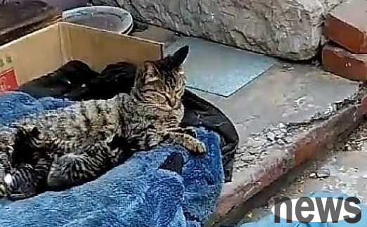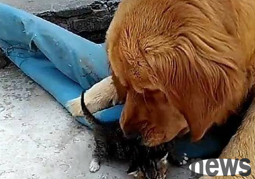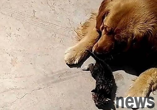 While the mother cat was breastfeeding, one of the kittens ran out of her arms, leaving several others to feed. This left the busy cat mother with no time to care about it. The cat father on the side was thinking about cat life and didn't notice it at all. The golden retriever looked at the lonely little kitten and had no intention of putting it back into the mother cat's arms, but decided to help take care of it. "Godmother" Golden Retriever walked up to the little milk cat that ran out, took it away and put it in the middle of the road to bask in the sun. It's just that the golden retriever's kindness makes people look a little bit distressed for the little milk cat.