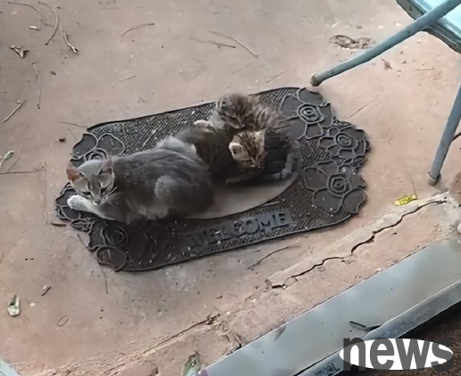Opening the door, you will see a female cat and two kittens.