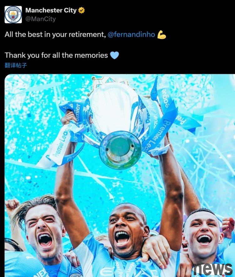 Manchester City officially posted a photo of Fernandinho holding the Premier League championship trophy, with the text: "I wish you all the best in your retirement! @Fernandinho. Thank you for all the memories you have brought us."