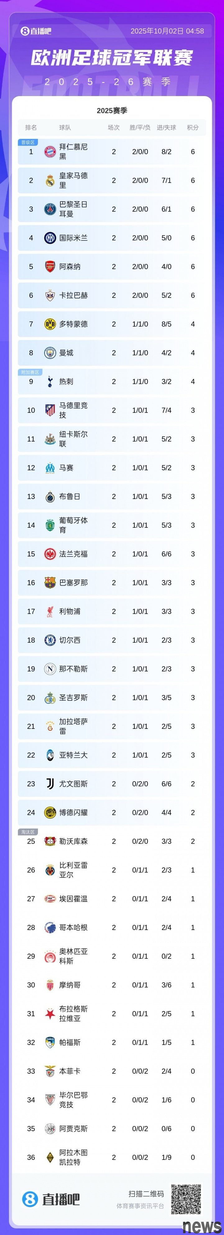 After the second round of the Champions League stage, Barcelona 1-2 Paris, Manchester City 2-2 Monaco, Arsenal 2-0 Olympiacos, Newcastle 4-0 San Giros, Leverkusen 1-1 Eindhoven, Dote 4-1 Biba, Naples 2-1 Portuguese, Juventus 2-2 Villarreal. The latest points are shown in the figure: