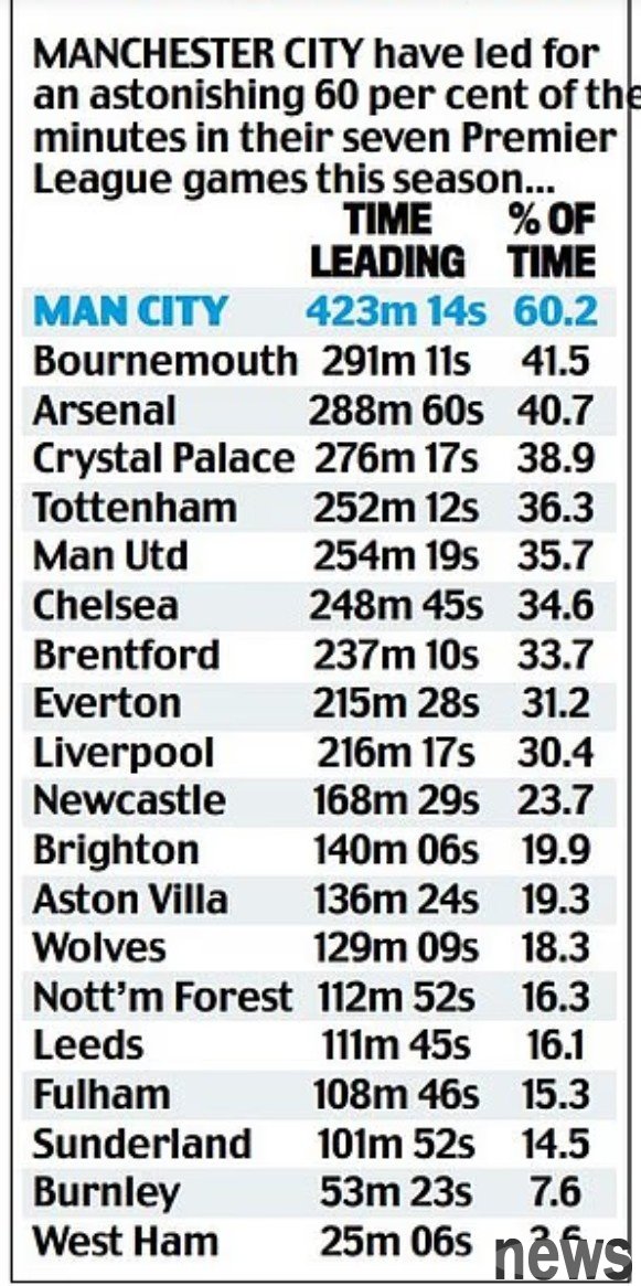 Although currently only ranked fifth in the standings, Manchester City's lead time reached 423 minutes and 14 seconds, accounting for 60.2% of the total game time. Bournemouth, Arsenal and Crystal Palace are the other three teams in the top four. Manchester United currently ranks 10th in the standings, but their lead time in the game can rank 5th among 20 teams.