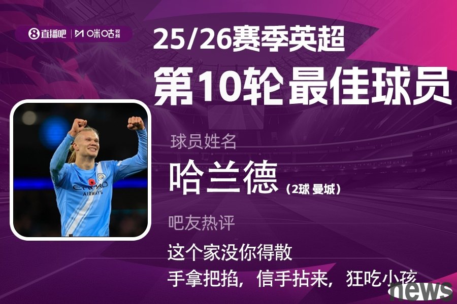 The 2025-2026 Premier League season is in full swing, and Migu Sports jointly launched each round of the Premier League's best player selection event! The results of the 10th round of selection have been released. Manchester City forward Haaland...